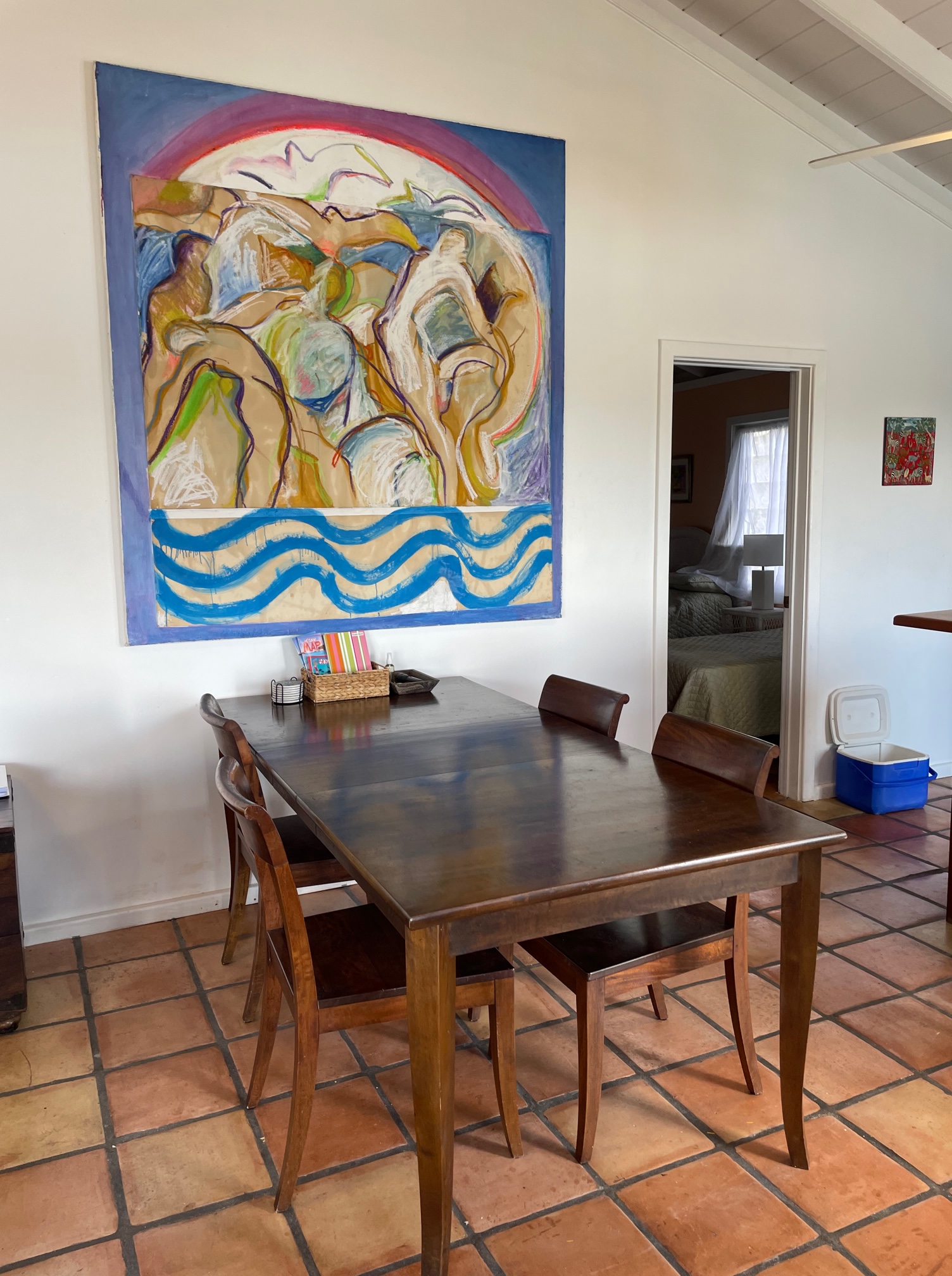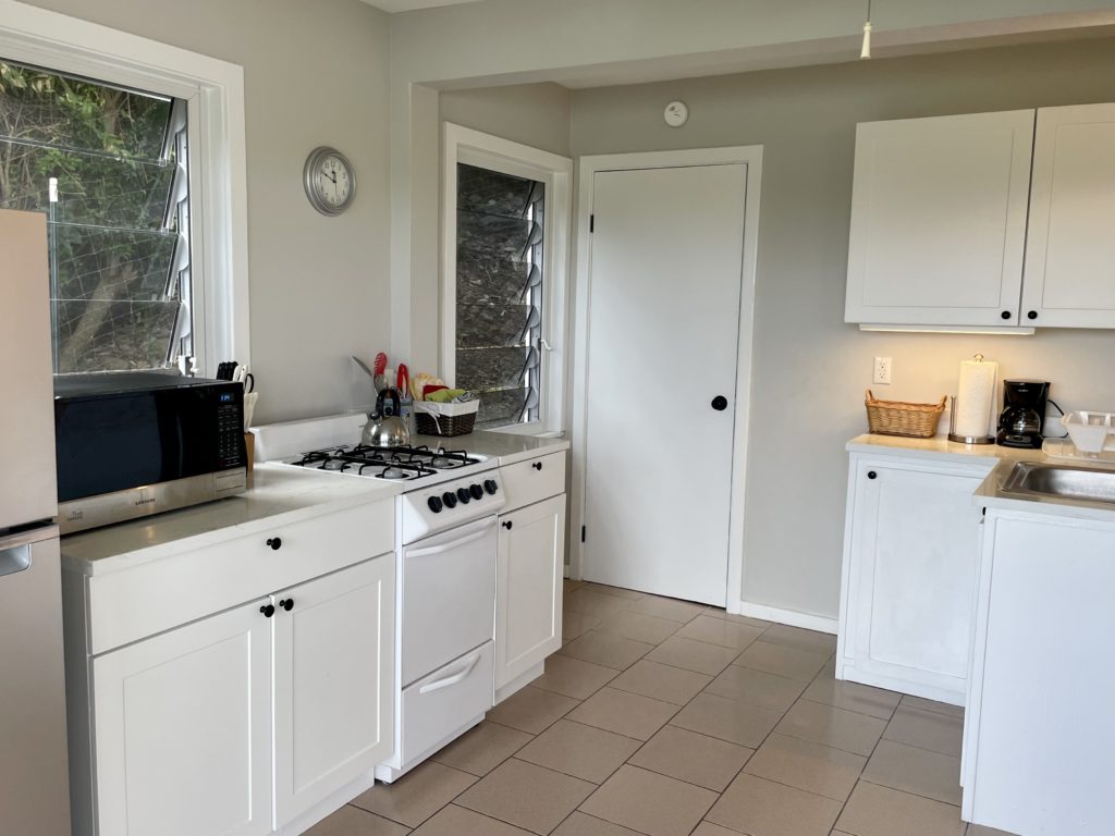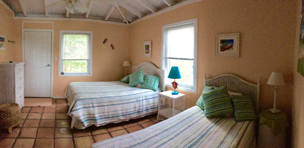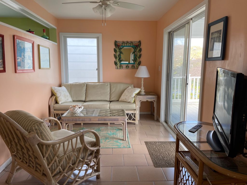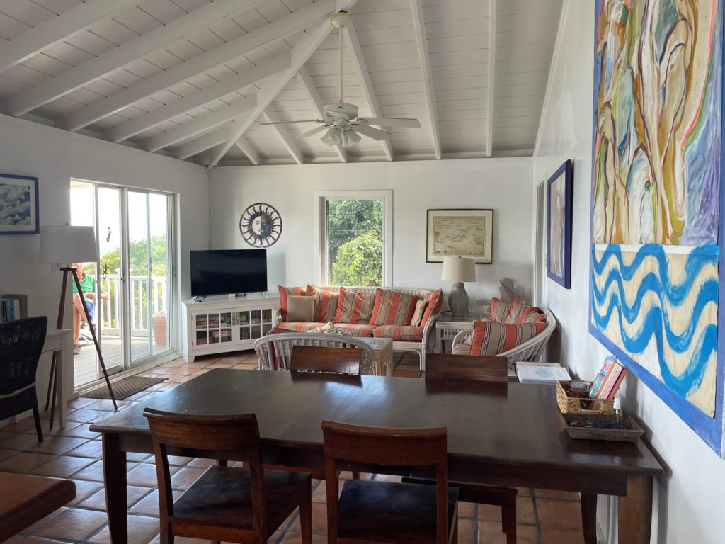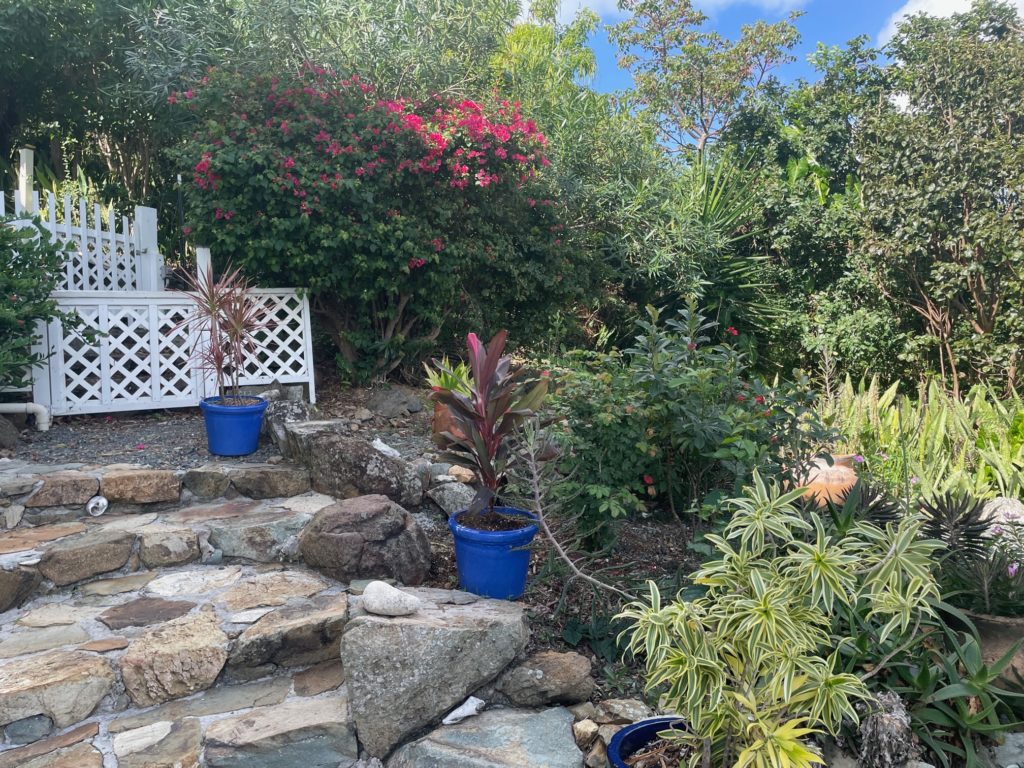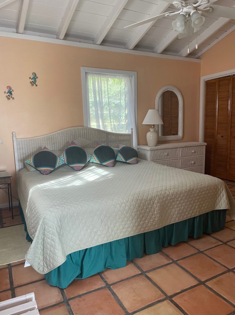 The garden level has its own entrance and large deck with panoramic views. It has a living/dining area, a kitchen, 1 bedroom with a queen bed, and a full bath. It is furnished in the same Caribbean rattan style, bright and colorful.